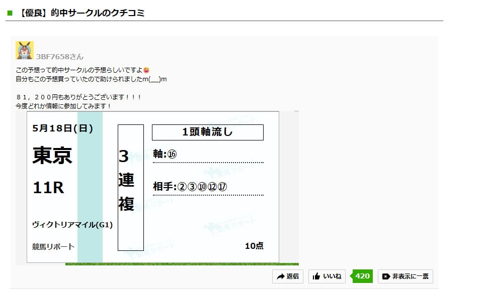 記事の冒頭でも話したヴィクトリアマイル(G1)の3連複を的中したのはコチラのサイトになります。