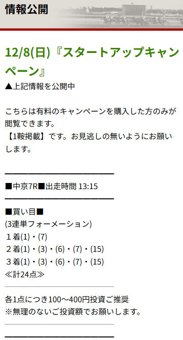 「スタートアップキャンペーン」に参加し、12月8日(日)に公開されていた買い目がこちらになります。