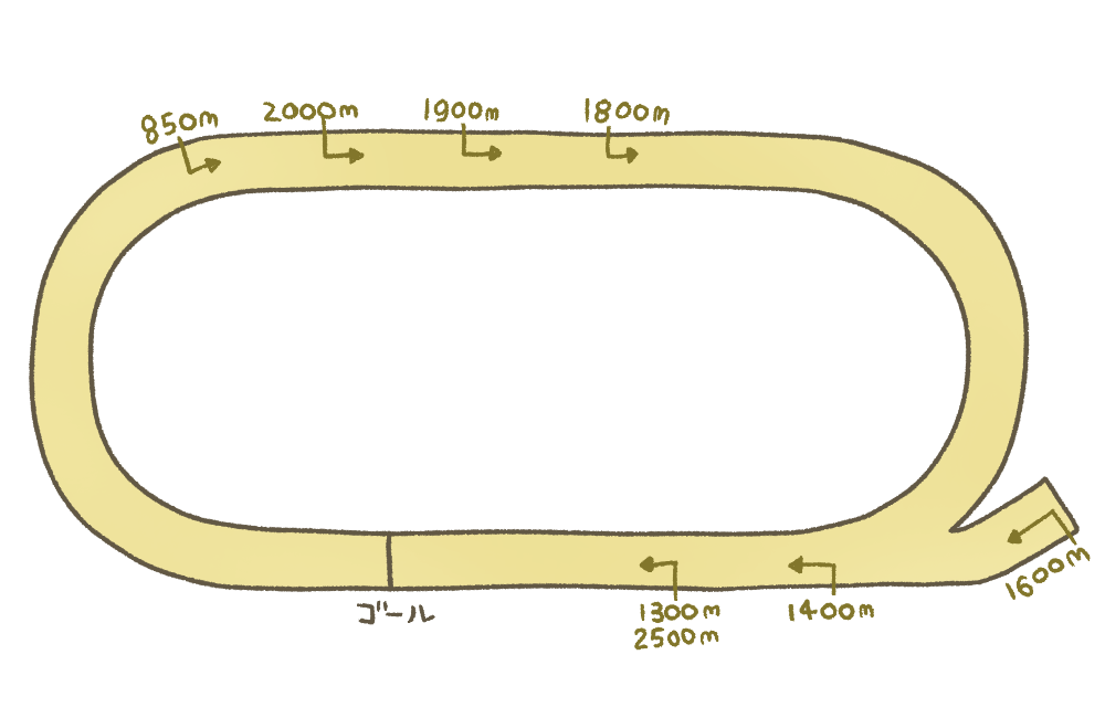 高低差は殆どなく逃げ・先行馬が有利ではあるが、コーナーは比較的緩いので、展開によっては差し馬も十分届く。