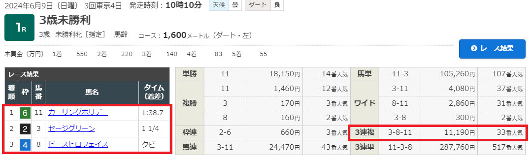 3-8-11で的中!万馬券いただきました!