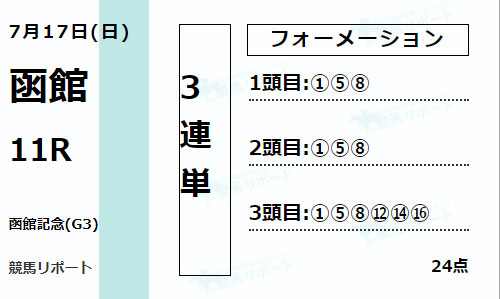 函館12R/ワイド③-⑨(7.2倍)③-⑥(24.2倍)⑥-⑨(11.7倍)全不的中
