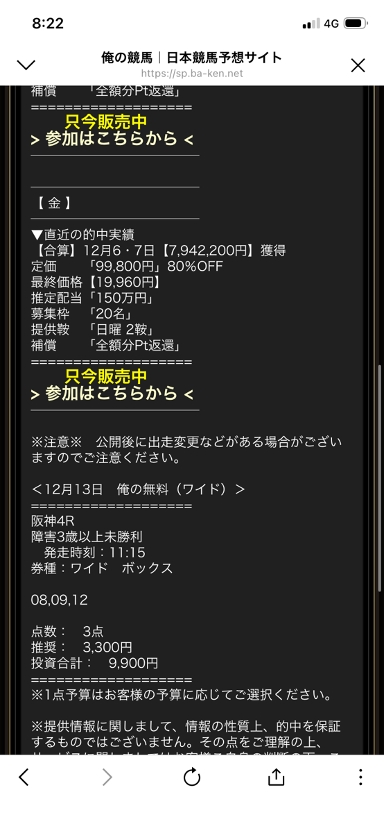 中山4Rの予想は1万3200円とそこまで配当高くなかったけど続く阪神8Rの予想では7万9200円とめっちゃ満足! G1資金集められてそのG1も当てられて一石二鳥の競馬サイト見つけたわ!