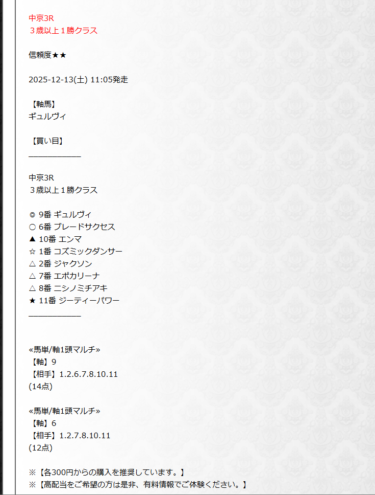 難しいハンデ重賞戦的中あざっした! 明日G1資金が貯められました、57,700円の配当でした! 明日も重賞無料で出るよね?楽しみにしています!