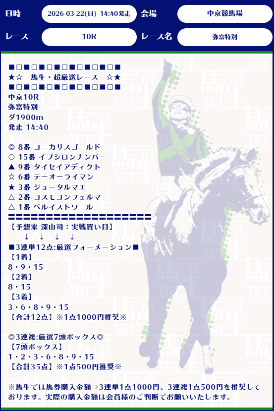 久しぶりの100万円越え的中おめでとうございます! スプリングステークスより金鯱賞の方が荒れるかなって思ったけどこっちの方が大荒れ10万馬券! 一撃1,708,700円的中は嬉しすぎます!毎度感謝です!