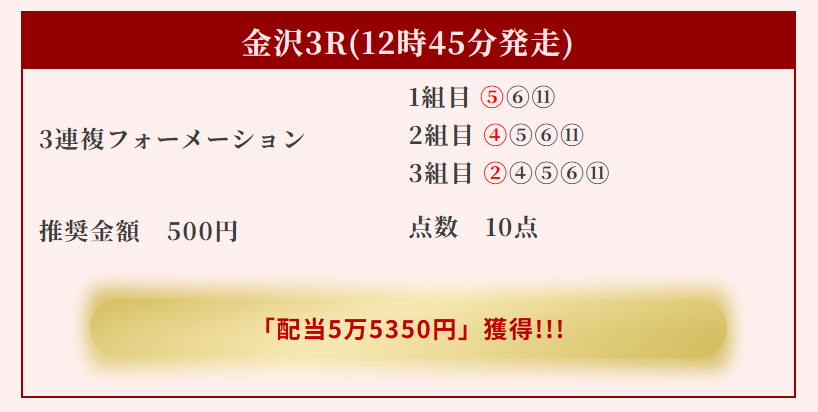 12/15(月)無料情報利用の検証結果です。 金沢3R予想、3連複フォーメーション買い目10点予想 1点500円・馬券代5000円 結果→3連複/110.7倍的中 払戻→5万5350円 余談ですが3連単も同じ買い目で361.3倍的中 3連複で5万弱でしたが3連単5-4-2的中した買い目で買っていれば 払戻18万650円、タラレバになってしまうが こっちも買ってれば3連複の3倍ちかく稼げました。