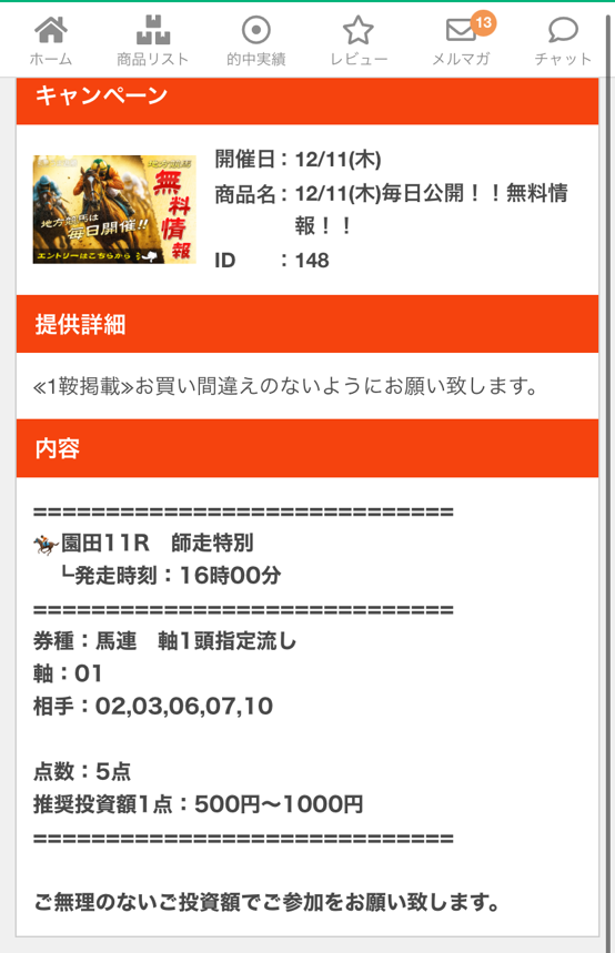 俺の競馬、ちょっと凄すぎて歴史をネットで調べてみました。 2014年にできて、今年で11年目を迎えるそう。 驚いたのは13日の無料予想です。 たかだがワイドの馬券種、しかも1万切る馬券代ですよ? 9-12的中で6万8970円払い戻し。 1点100円で3連単689倍攻略するのと同じ考えを持てば 無理に当てずらい3連単じゃなくてもワイドでも3連単級の的中が掴めると老舗サイトに教えてもらいました。 自分自身の馬券術も向上しそうです、俺の競馬を使い続ける事で。