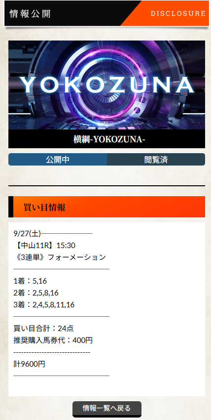 毎日王冠の無料情報当たりましたね! ありがとうございますm(__)m 横綱ダービーの的中率めちゃいいですよね♪