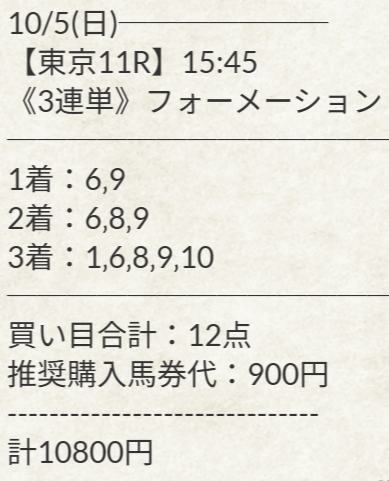 毎日王冠、完全前残りでコーナー通過順位1~3頭で決まりましたね~ 固め決着だったけど132倍付きましたね~オイシイレースですした ⑨-⑧-⑩132.5倍×900円で11万9250円払い戻し。 馬券代が10倍になってウレシイです。