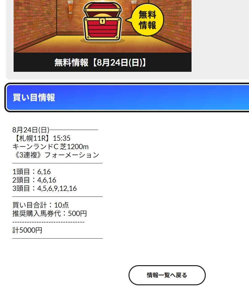 毎週欠かさず参加している、リホラボの直前情報。 今回は140,700円の払戻しでした! 馬券代は5,000円だったので135,700円のプラスになりました!