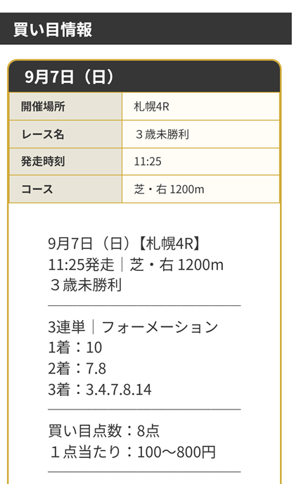 よーしよし、戦歴は4戦2勝。 土曜日→新潟7R 322,320円的中 日曜日→札幌9R 455,200円的中 --------- 合計777,520円 的中率も大事ですが回収率が+なら何の文句もなく使えます。 初めての利用ではないですが的中率は平均的に毎度こんなもんですかね~。